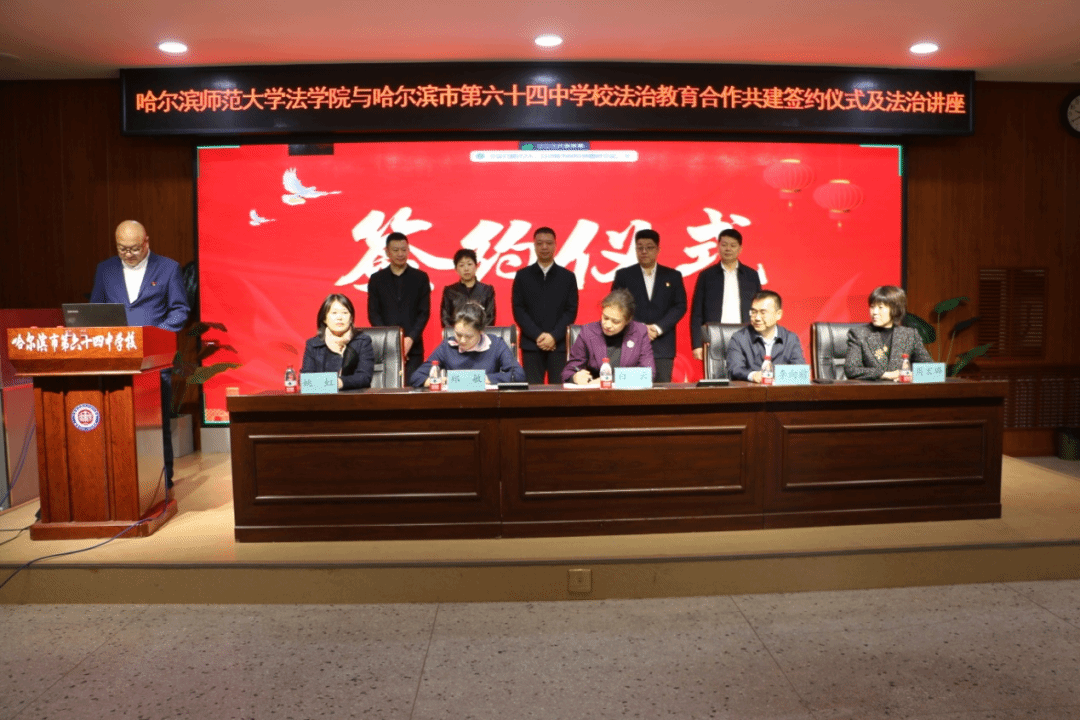 为深入贯彻党的二十大精神,树立和弘扬社会主义法治精神,深入开展青少年法治宣传教育,促进未成年人健康成长,2024年4月2日上午,哈尔滨师范大学法学院与哈尔滨市第六十四中学校法治教育合作共建签约仪式暨“普法进校园”宣讲活动在哈尔滨市第六十四中学校举行。出席本次活动的有哈尔滨师范大学法学院院长白云、副院长周宏璐、教授姚虹、黑龙江省司法厅普法与依法治理处副处长李天龙、普法与依法治理处四级调研员杨武铭、哈尔滨市司法局普法与依法治理处二级调研员孙屹鹏、香坊区司法局党组书记、局长张兰阁、香坊区教育局副局长李向前、香坊区司法局四级调研员王伟、香坊区教育局行政执法科科长赵伟、哈尔滨市第六十四中学校党支部书记、校长郑敏及哈尔滨市第六十四中学校全校师生。