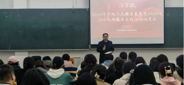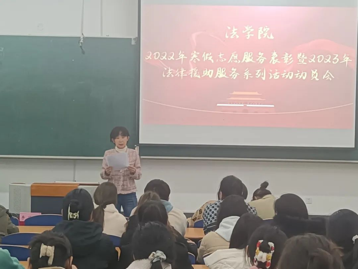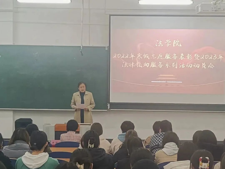 为深入贯彻落实习近平总书记关于深入开展学雷锋活动的重要指示精神,进一步引导青年学子争当新时代雷锋精神的倡导者、推动者和践行者,法学院于3月3日下午五点在崇师楼c506室举办2022年寒假志愿服务活动表彰会暨2023年法律援助服务系列活动动员会。党委书记李晓航、院长白云、党委副书记王敬国、副院长周宏璐,辅导员孙振轩、徐鑫怡及各年级学生代表参加会议。会议由王敬国主持。