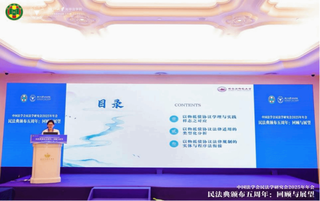 本次年会主题为“民法典颁布五周年:回顾与展望”,来自全国民法学界的专家学者及法律实务部门500余人参会,围绕《民法典》实施5周年以来的民法学理论与实践热点、难点问题展开讨论。年会设置7个主题、21个单元的专题讨论。姚虹教授在第三单元就《以物抵债协议法律适用的规制路径分析》作主题报告。姚虹针对以物抵债协议的学理认识与实践样态加以对比分析,提出以物抵债协议法律规制的实体与程序法衔接路径构想。