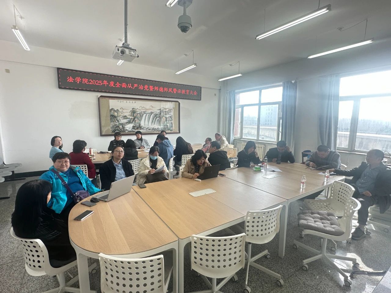 为深入学习贯彻学校党委各项部署,落实法学院年度重点任务,以严的基调推动全面从严治党和师德师风建设向纵深发展,4月16日,法学院于崇师楼428召开2025年度全面从严治党工作会议暨师德师风警示教育大会。学院领导班子、全体教职工参会,会议由院长白云主持。