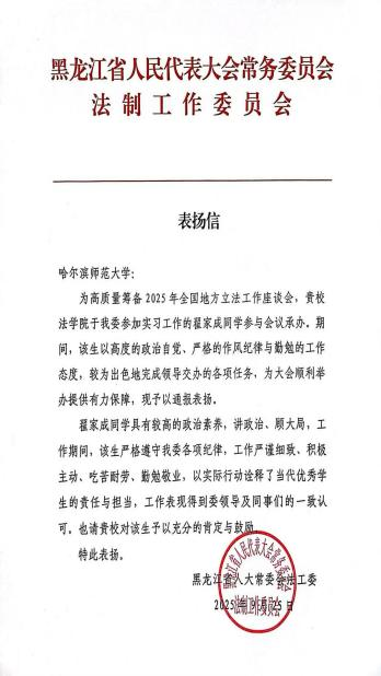 近日,我院2023级研究生翟家成同学以扎实的专业能力、勤勉的工作态度和严谨的工作作风在实习岗位上绽放光彩,以实际行动诠释了新时代青年与优秀学子的使命担当,赢得了实习单位黑龙江省人民代表大会常务委员会法制工作委员会的高度认可与一致好评,并向我校发来表扬信予以表彰。